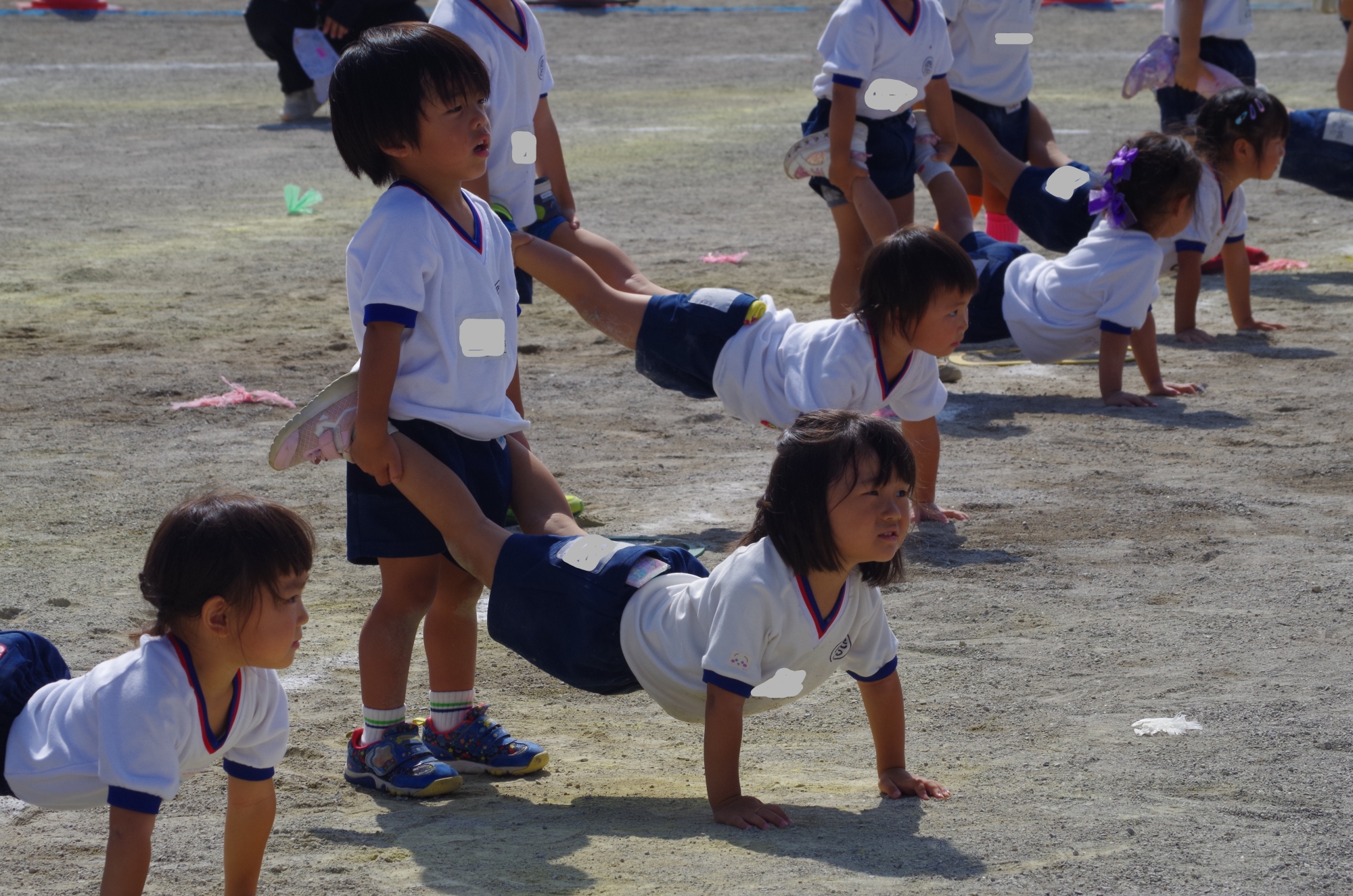 年少さんの組体操は、お友達と協力して動物に変身しました。