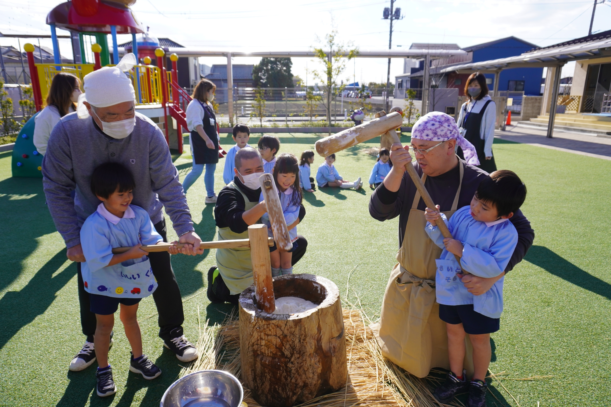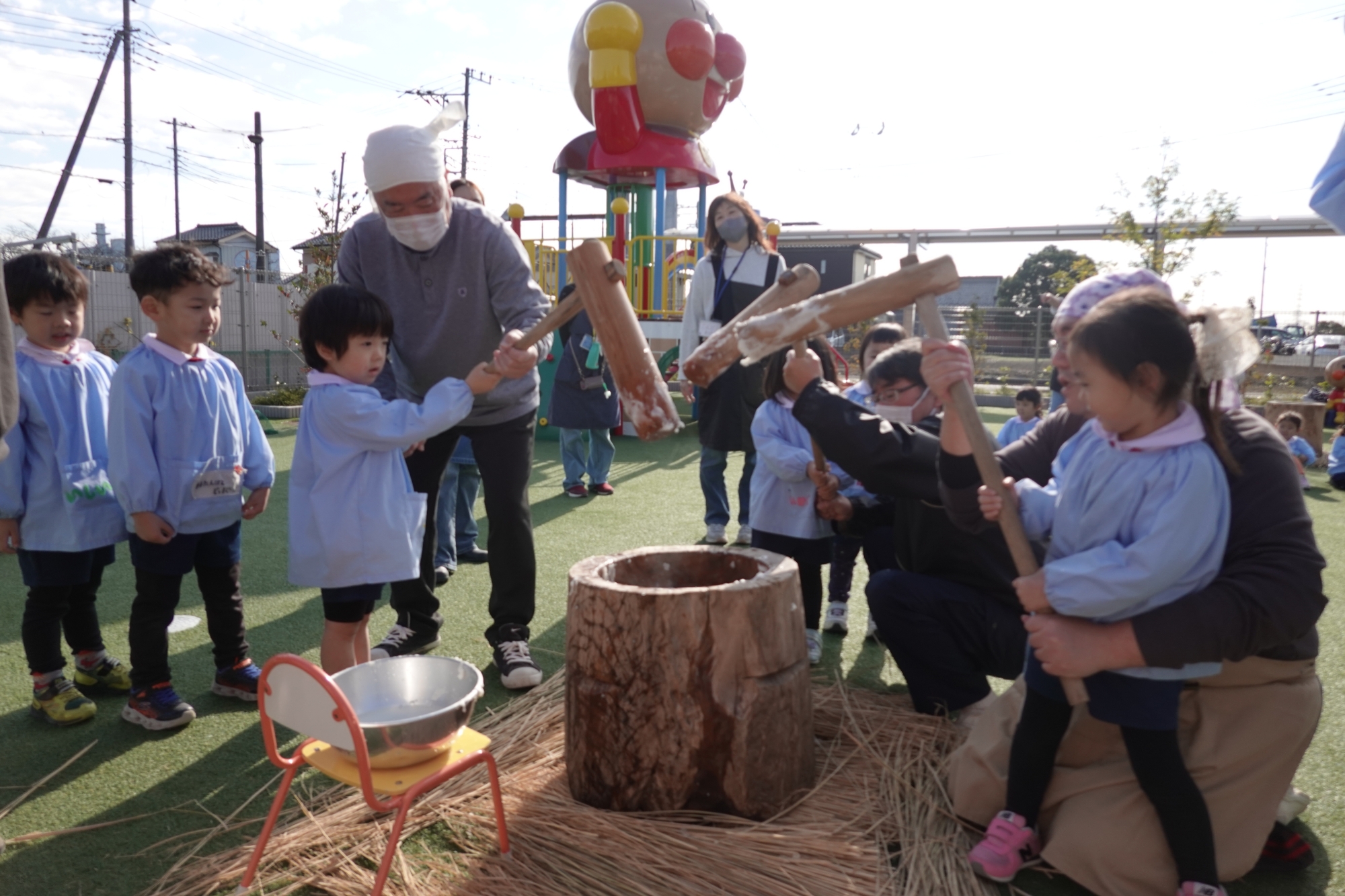 幼稚園のお友だちや乳児のお友だちが先生と一緒に両手で杵を持ち、