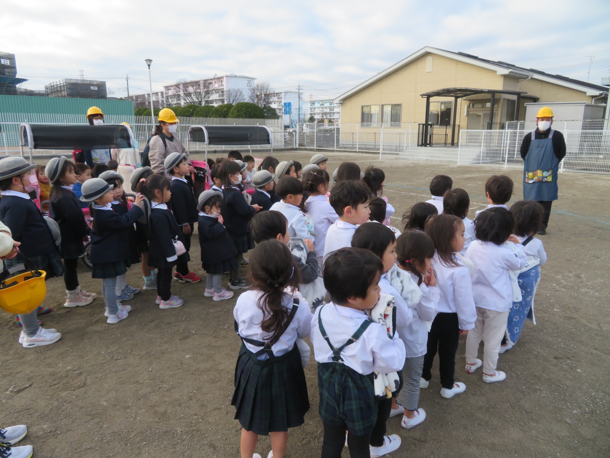 給食室から火災が出たと想定して、「火災が発生しました」との声掛けで園舎から避難をしました。