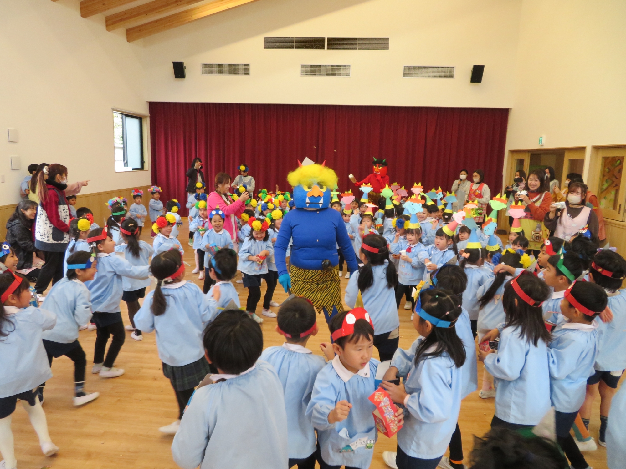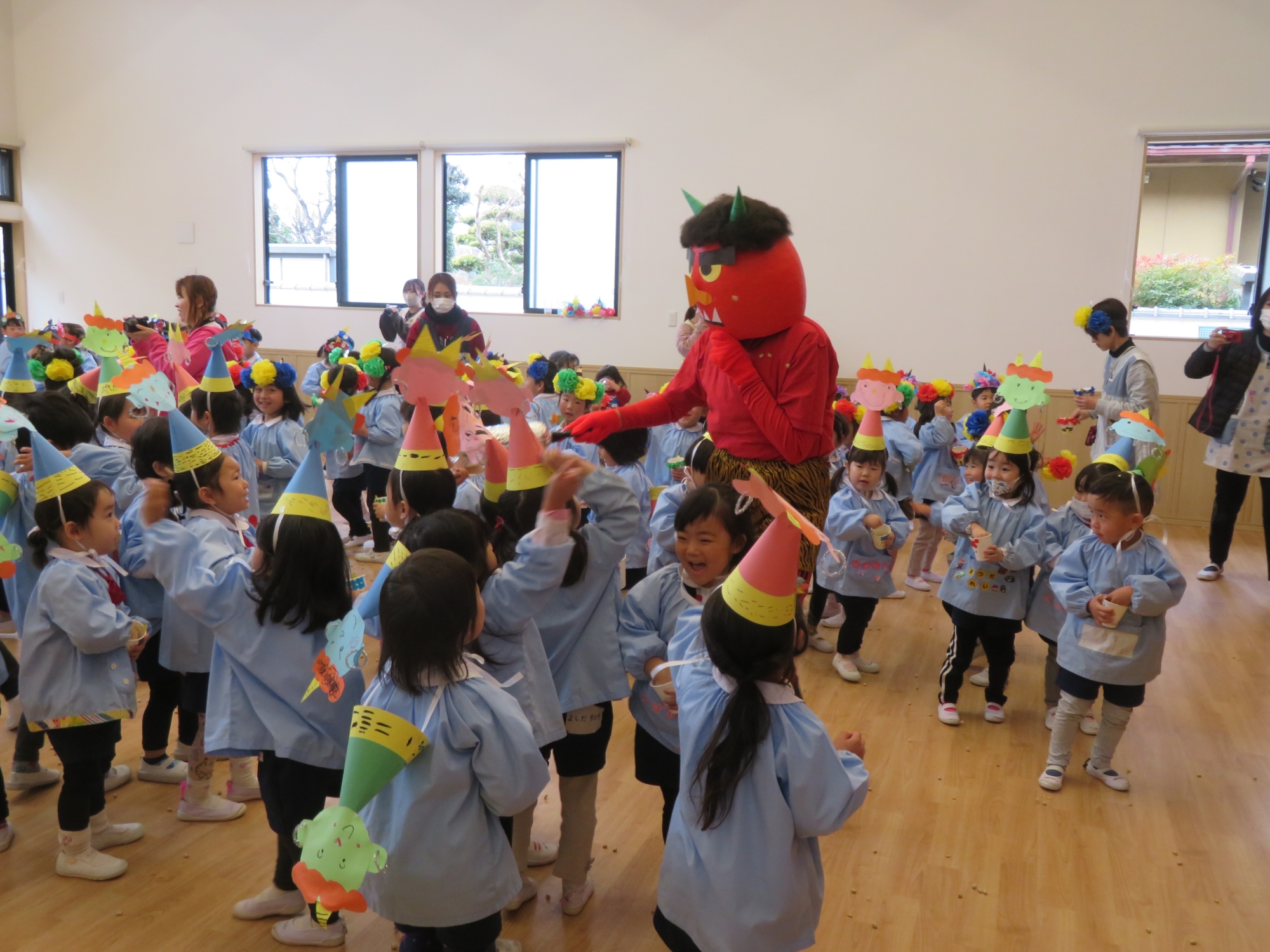 今日はにじぐみ・そらぐみさん、未就園児教室のステップさん、年少・年中・年長の全園児で「豆まき」を行いました。