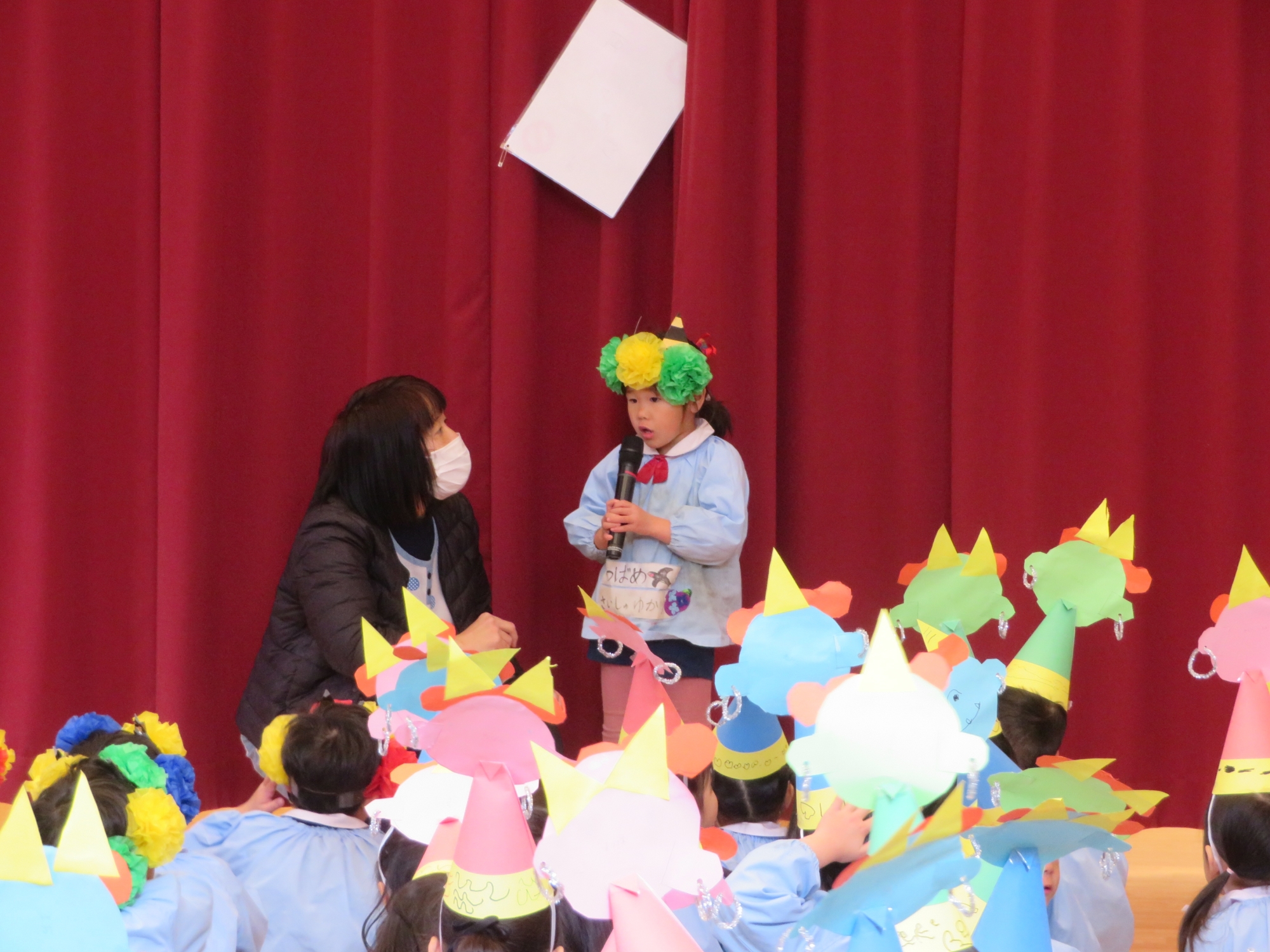 ホールに集まって「なぜ、せつぶんに豆まきをするの?」という紙芝居を見ました。