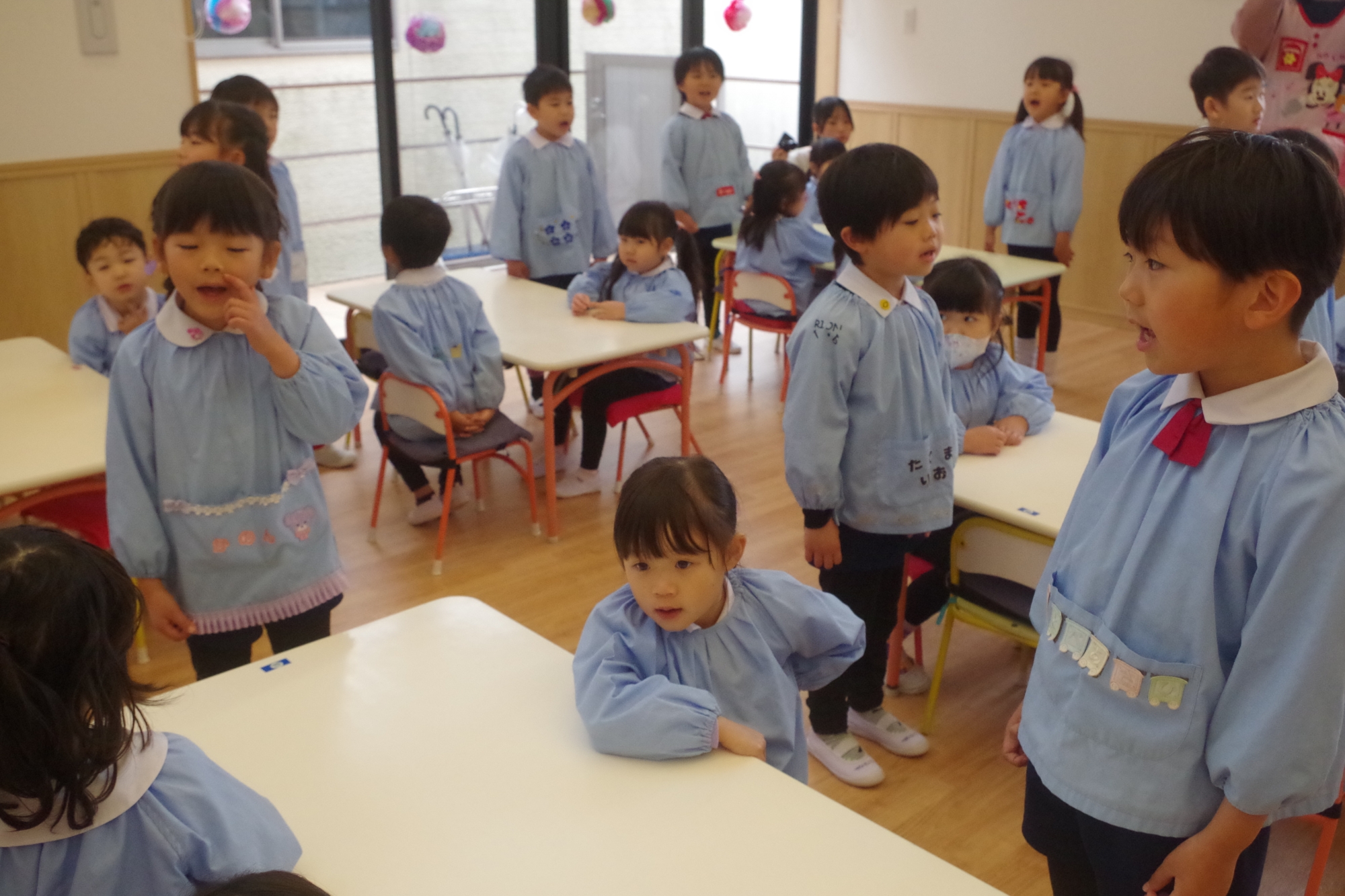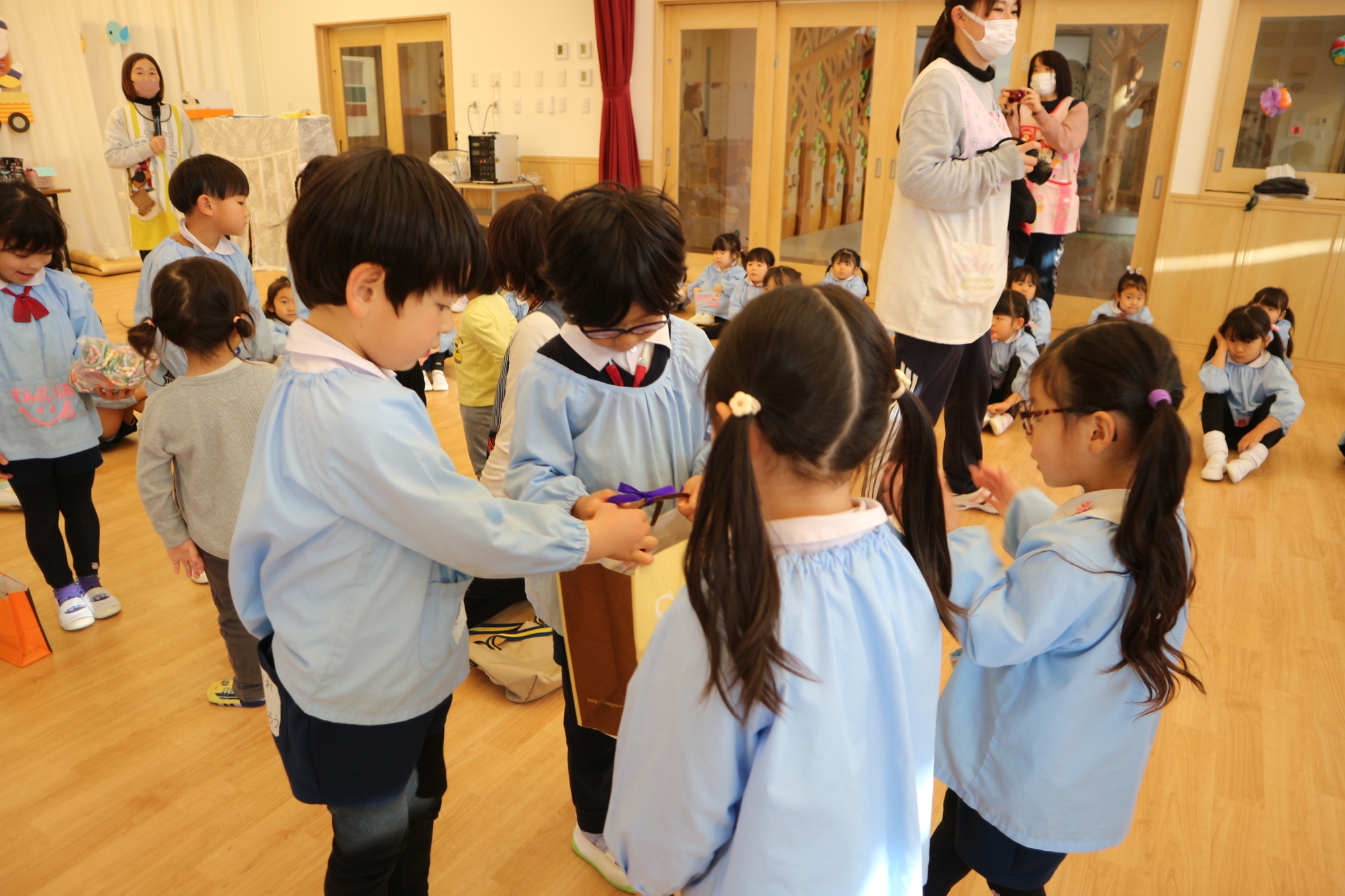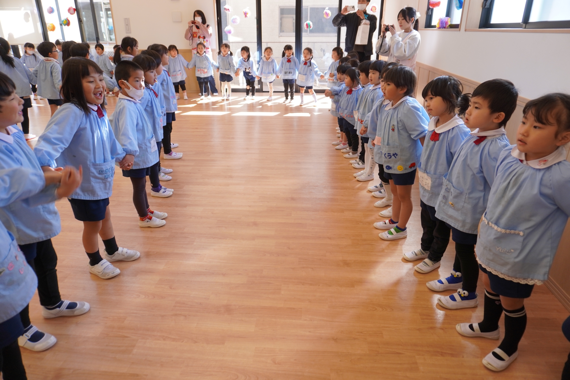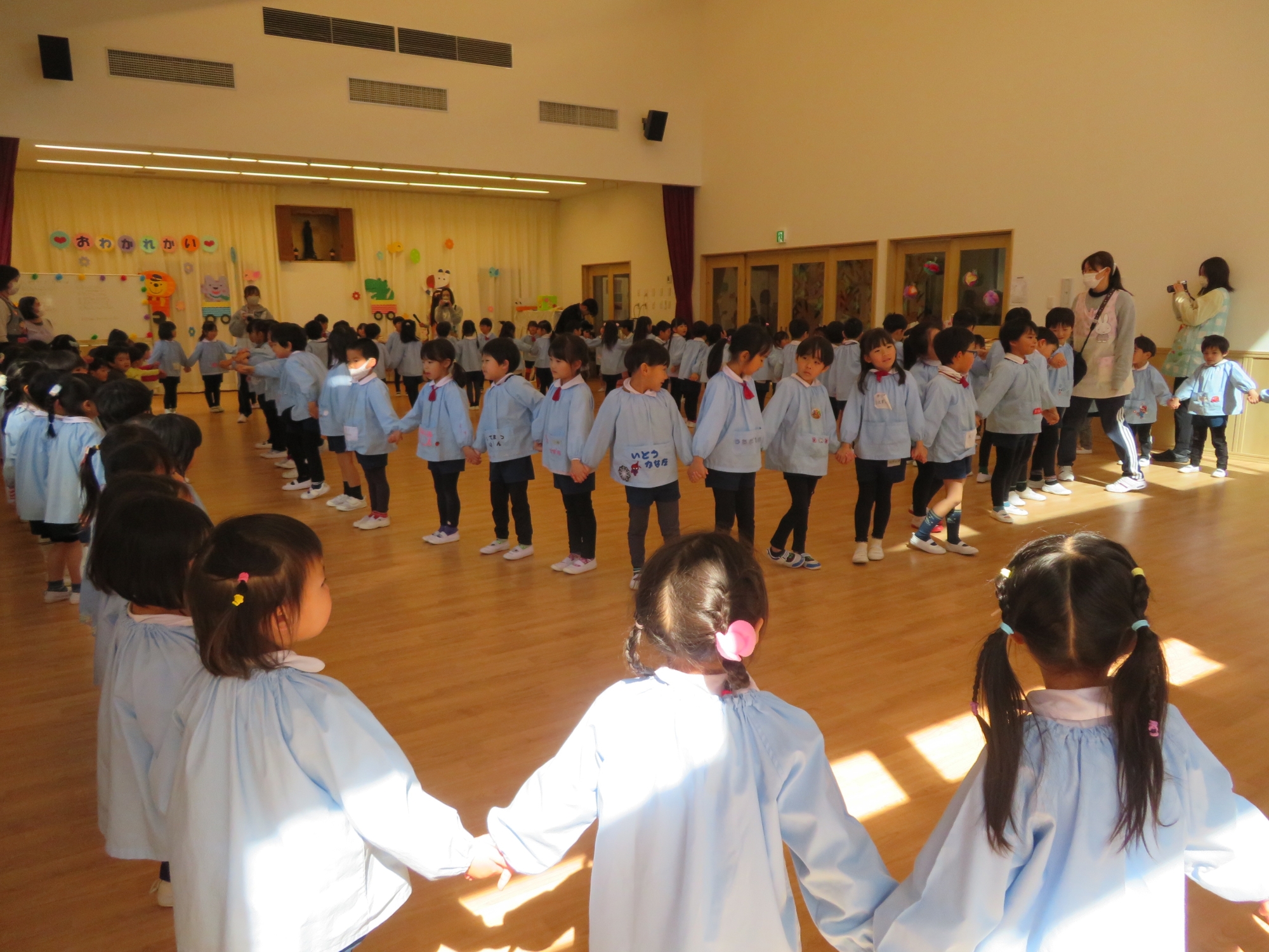 幼稚園のお友達、にじぐみさん、そらぐみさんみんながホールに集まり年長さんに感謝の気持ちを