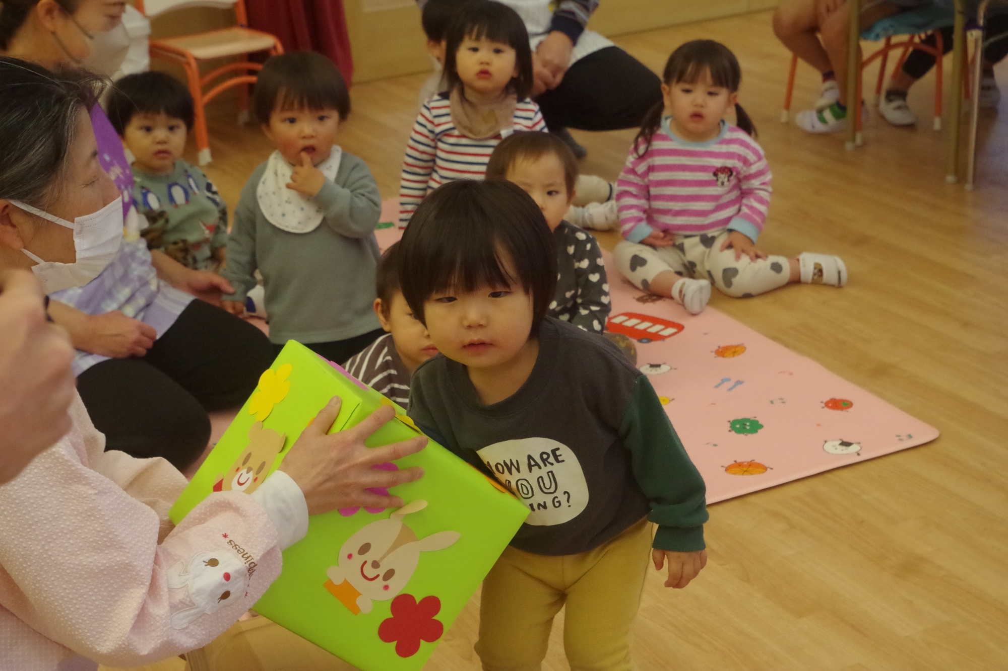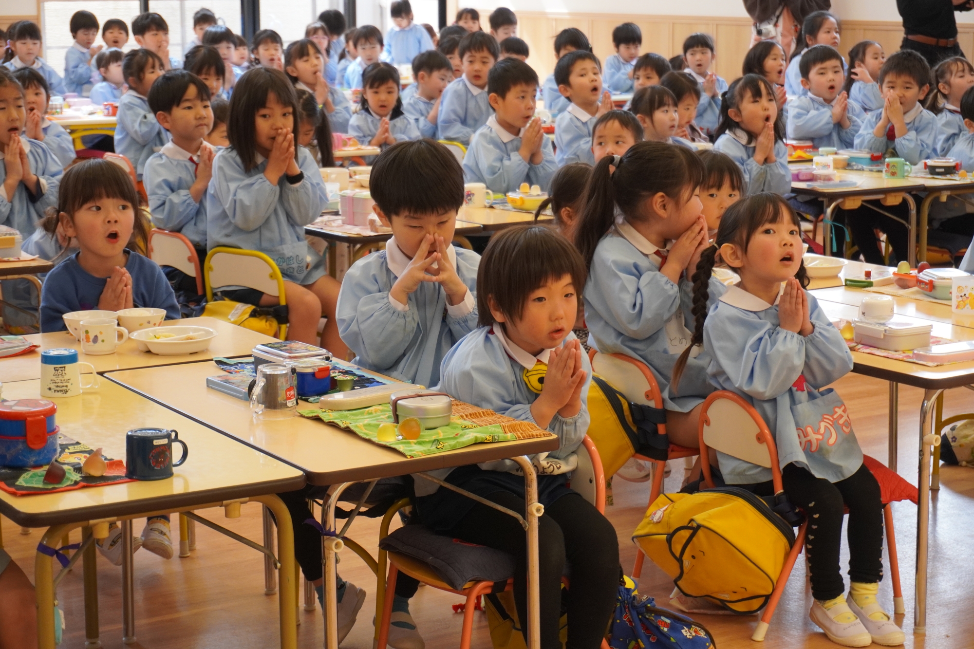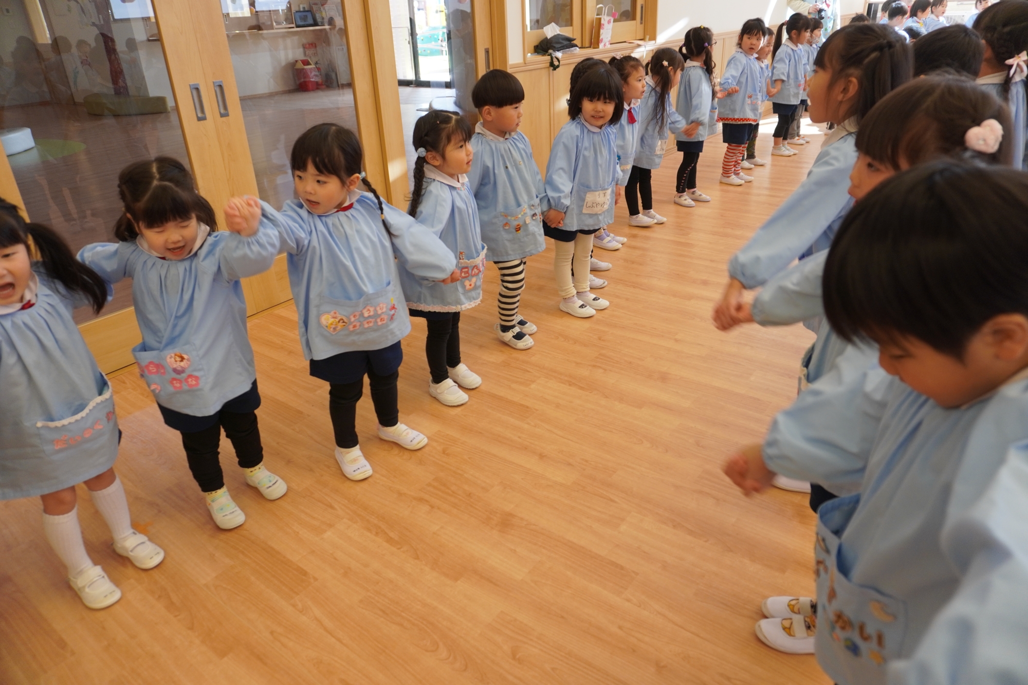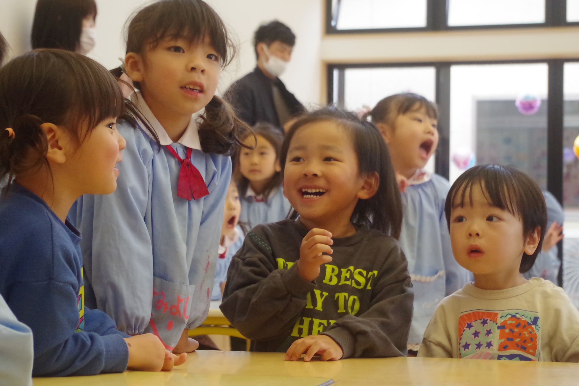 幼稚園のお友達、にじぐみさん、そらぐみさんみんながホールに集まり年長さんに感謝の気持ちを